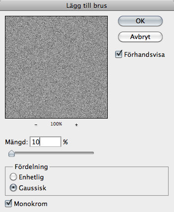 Att skapa en snygg kornstruktur är svårt i Photoshop. Jag brukar göra det genom att addera ett par, tre lager som jag fyller med grå färg och sedan lägger i blandningslägenaTäcka över, Mjukt ljus eller Hårt ljus. Sedan lägger jag på brus på dessa lager (Filter > Brus > Addera brus). För att få fram lite mer slumpmässsig variation på kornstrukturen använder jag olika inställningar på mängden i respektive lager. Jag avslutar med att öppna lagrets Lagerstil (Lager > Lagerstil > Blandningsalternativ) och dra bort synbarheten på dessa lager genom att dra den svarta och vita triangeln i det underliggande lagret mot mitten. På så sätt syns kornet mest i mellandagrarna och mindre i hög- och lågdagrar, vilket skapar en trovärdigare effekt.