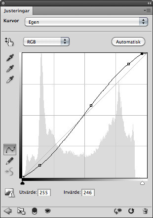 Jag avslutar alltid en konvertering till svartvitt med ett kurvjusteringslager, där jag trycker samman skugg- och högdagertonerna och ökar kontrasten i mellantonerna. Den svartvita filmen har en helt annan tonskala än vad vi får från våra digitala kameror. För att få fram ett resultat som mera påminner om vad film ger är denna kontrastökning viktig.