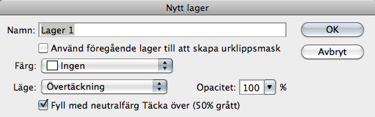 Skapa ett nytt lager genom att hålla ner alt-tangenten, samtidigt som du klickar på ikonen för att skapa nytt lager i lagerpanelen. Då öppnas dialogrutan för att ställa in blandningsläge på lagret. Jag väljer Mjukt ljus eller Övertäckning som blandningsläge och fyller sedan lagret med grå färg.