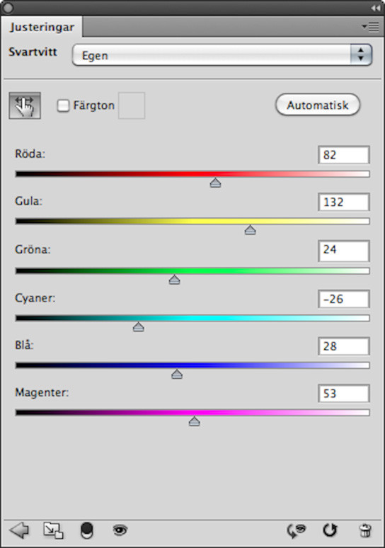 Men den smidigaste metoden är att använda justeringslagret Svartvitt (Lager > Nytt justeringslager > Svartvitt). Genom att klicka på justeringsfingret i dialogrutan kan du sedan klicka på olika färger i den ursprungliga färgbilden. Sedan drar du till vänster med fingret för att mörka ner dessa färger, åt höger för att göra dessa färger ljusare i den svartvita bilden.