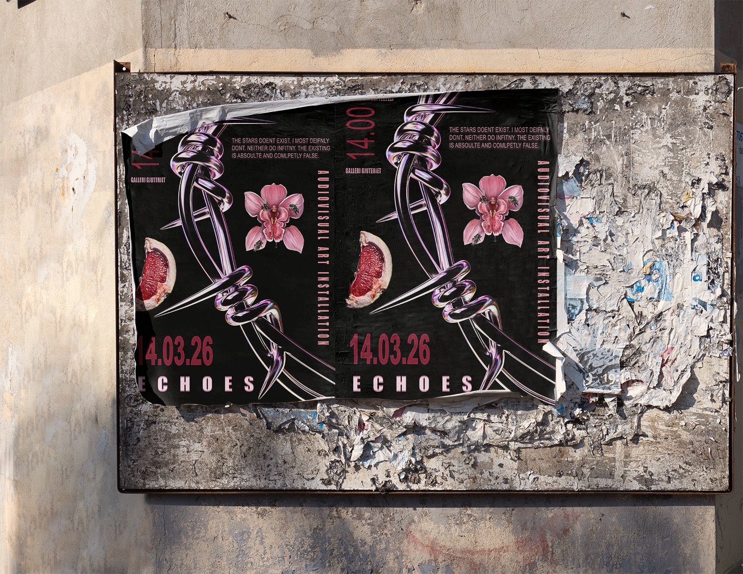 I konstinstallationen ECHOES kliver du in i ett fysiskt, metafysiskt rum där det verkligaste som existerar är du. Eftersom allt är ingenting och ingenting är allt, för evigt och aldrig pågående. Stjärnorna existerar inte. Det gör definitivt inte jag heller. Inte heller oändligheten. Existensen är absolut och fullständigt falsk. Echoes bjuder in dig att uppleva denna paradox — att bli ekot, frånvaron och närvaron på samma gång.