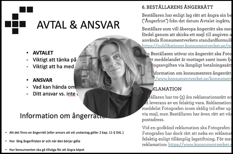 Astrid Nymansson underströk dock att exempelavtalet är just ett exempel. Det är tänkt att anpassas efter den egna verksamheten, arbetssättet och vad som faktiskt erbjuds i uppdraget. Det är viktigt att formuleringarna speglar det som du som fotograf kan och vill utlova.
