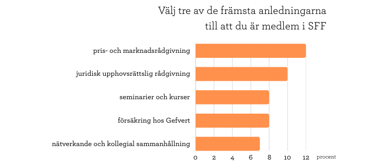 När medlemmarna får ange vad som är viktigast i medlemskapet hamnar rådgivning högst. Juridisk upphovsrättslig rådgivning och pris- och marknadsrådgivning toppar listan. Därefter följer försäkringen hos Gefvert, seminarier och kurser samt möjligheten till nätverkande med kollegor.