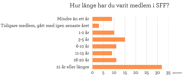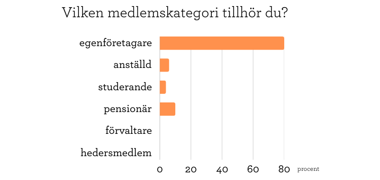 Undersökningen genomfördes i december 2025 och besvarades av omkring 200 medlemmar. Den visar att många har en lång relation till förbundet – flest svarande uppger att de varit medlemmar i över 21 år. Samtidigt är en tydlig majoritet egenföretagare.