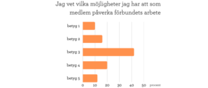 Samtidigt pekar undersökningen på att kommunikationen kan bli tydligare. På frågor om hur man som medlem kan påverka förbundets arbete och vilka frågor styrelsen arbetar med är svaren mer spridda, och många placerar sig i mitten av skalan.