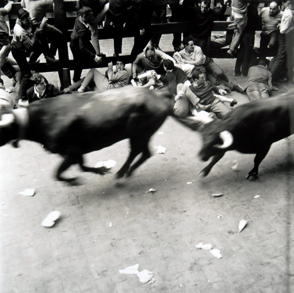 De vasshornade tjurarna ska just släppas inför sitt gatlopp till arenan. Ser en berusad och upphetsad hord unga män som strax sätter allt på spel. Frivilligt. Många bär traditionell röd halsduk och en hoprullad tidning som löjeväckande vapen. Ordningsmakten trycker tillbaka adrenalinstinna hetsporrar. Spanande blickar från balkongerna. Kollar kamerans inställningar. Beredd.