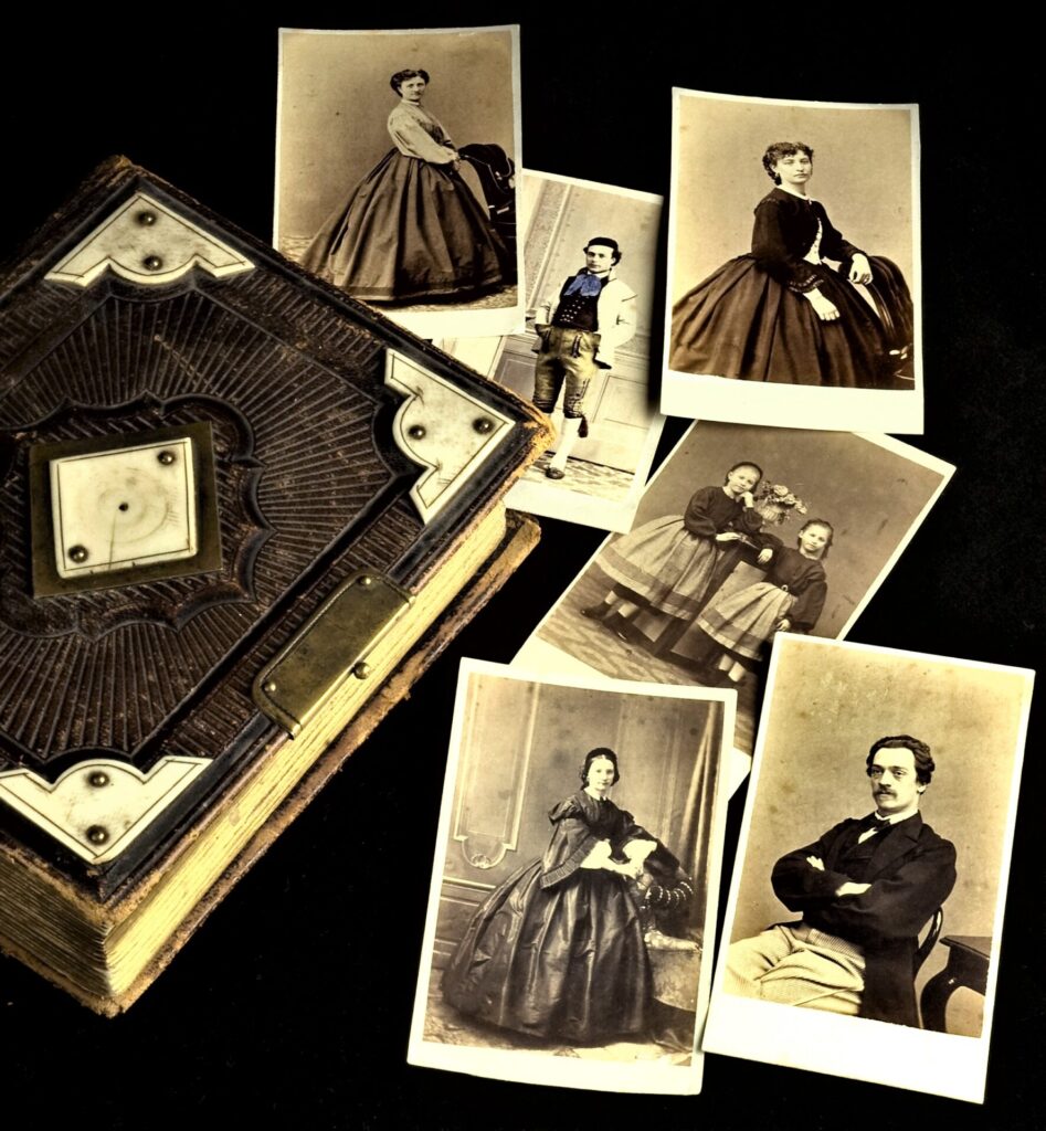 Visitkortens standardiserade format 6×9 centimeter resulterade i massproduktion av fotoalbum med särskilda insticksfickor. Den fotografiska kopian monterades på en styv så kallad blankett. Dessa tidiga exempel på visitkort saknar dock text. Senare angavs fotograf och adress både på fram- och baksida. Foto: Björn Axel Johansson