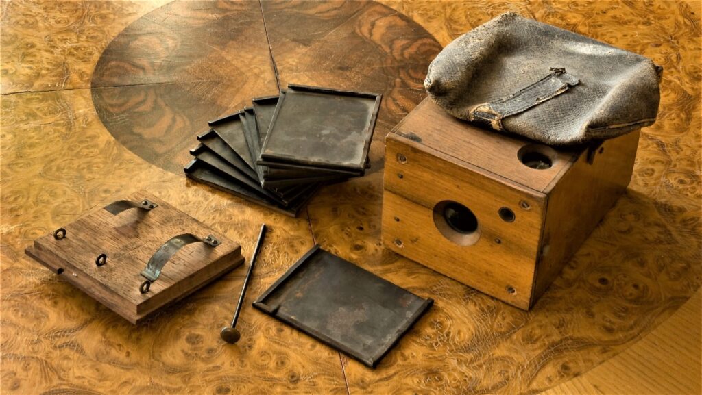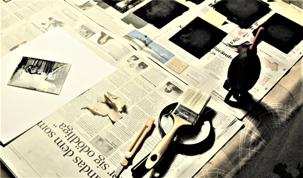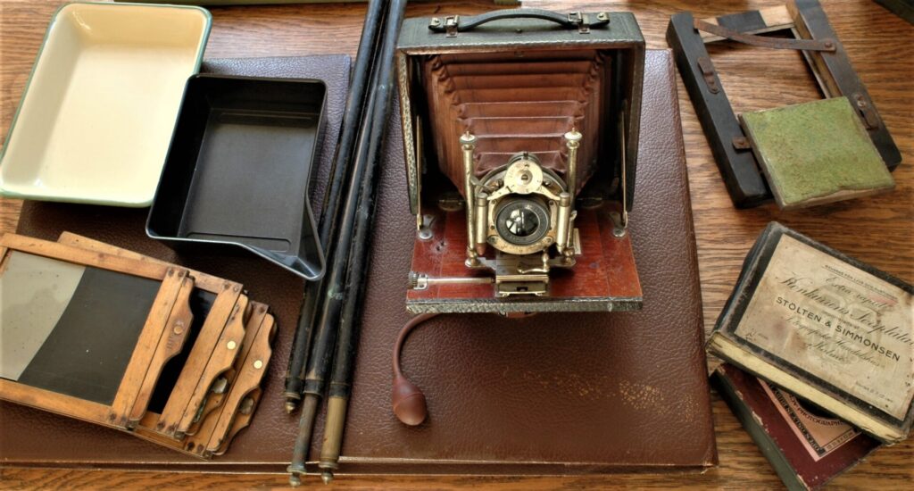 Bälgkamera för kassettladdad torrplåt 9×12 centimeter och framkallningsskålar för negativ. Uppe till höger en ram för kontaktkopiering på dagsljuspapper. Ännu vid tiden för första världskriget saknade en del fotografer elektricitet och var helt beroende av dagsljus. Foto: Björn Axel Johansson