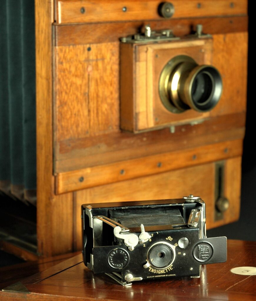 Årtiondena runt 1900 var en brytningstid. Det gamla ställdes mot det nya; glasnegativ mot rullfilm, trä mot metall, stativbundna mot handhållna kameror. Här en resekamera för större torrplåtar och en amatörkamera för rullfilm med sex negativ i format 4×6 centimeter. Foto: Björn Axel Johansson