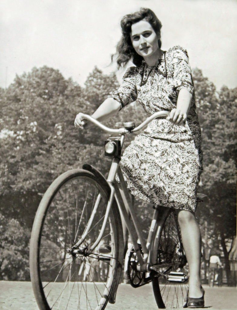 Cykel med ballongdäck, batteridriven lampa och väl tilltagen ringklocka var ett mycket vanligt fortskaffningsmedel under krigsåren. Det gällde även för Mona Fridman. När Kary såg henne anade han att här kom ett cyklande omslagsfoto. Och så blev det. Foto: Ur familjens fotoalbum.