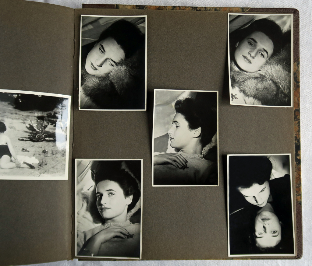 Fem inklistrade fotografier i Monas fotoalbum. Fotograf Lasch har inte bara eftersträvat en atmosfär av glamour. Han har också experimenterat med speglande bildeffekter. På baksidan av de svartvita fotografierna finns en stämpel, ”Nordiska Kompaniet”. Han saknade ett eget mörkrum och använde sig istället av NK:s fotoavdelning. Men bilderna är bara svartvita råkopior. Originalbilderna är i färg och finns kvar som lösa påsiktskopior.
