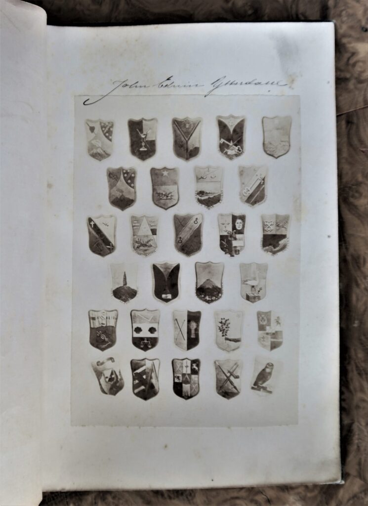 UPPENBARLIGEN hade Kjellin goda tidningskontakter och representanter för pressen erbjöds insyn i projektet. Det hette bland annat att albumet var ”både prydligt och ganska omfattande” och det noterades att titelbladet utgjordes av de vapensköldar som de ”högtuppsatte” låtit framställa. För en nutida betraktare tycks de något fantasifulla och når kanske inte upp till den kvalitetsnivå som landets adelssläkter kunde uppvisa, ordenssällskapets förebilder.