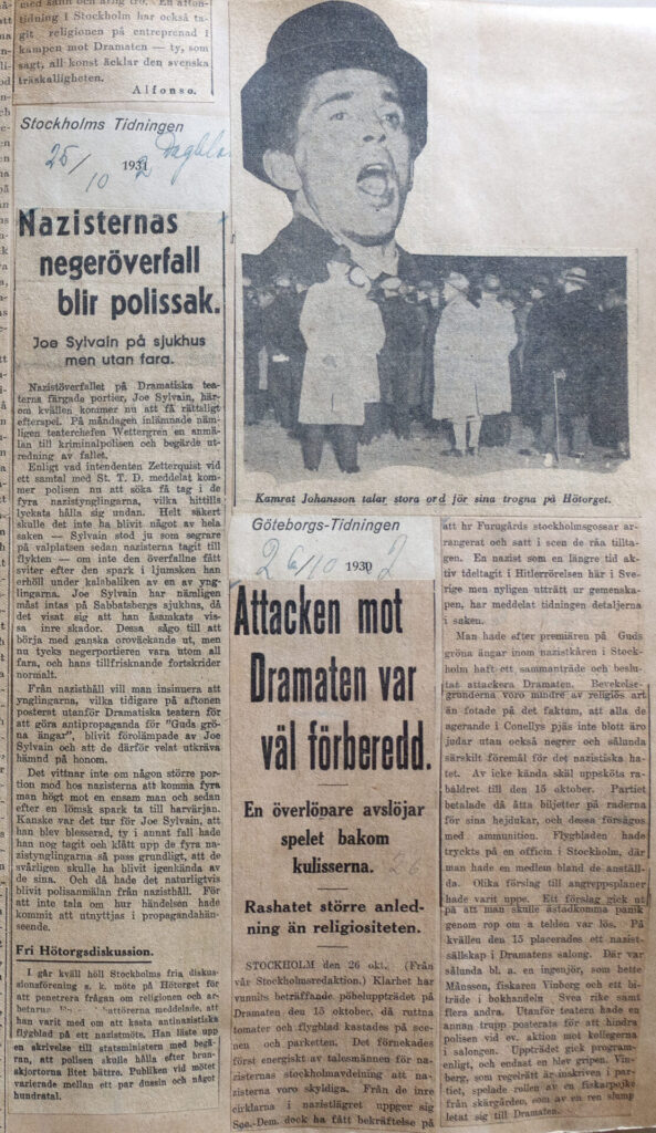 Morfar fick lugna den upprörda stämningen. Man inkallade polis. En yngling haffades, de yngsta släpptes, resten flydde. På flygbladen, som spritts över salen, stod att läsa: ”Sverige! Vakna! Vakna till protest mot det system som tillåter sådan religionssmädelse som vi här bevittna! Reagera mot kulturförfallet!” Undertecknat: ”Närvarande nationalsocialister.” Det var rashat det handlade om, inte religion. Joe Sylwan blev också gravt misshandlad av några av gossarna, ”skrudade i nazistskjortor”, enligt rapport i pressen några dagar senare. Det övergreppet räknas som Sveriges första hatbrott mot en afrosvensk.