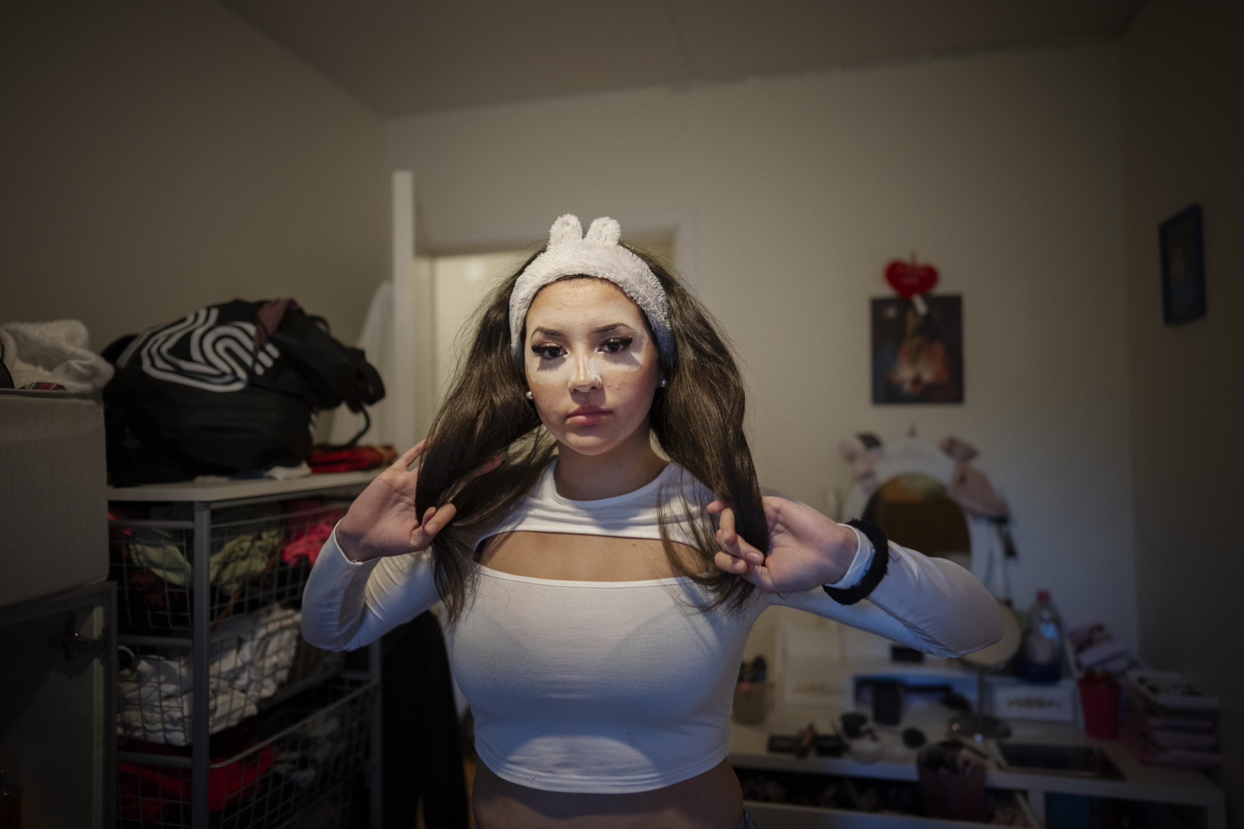 Denise går runt i sitt rum och väntar på att sminket ska sätta sig den 23 September, 2023, i Hässelby. Hon ska snart åka in till T-centralen för att möta upp några kompisar som hon lärt känna via TikTok.