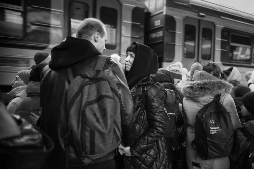Bildtext till Eddy van Wessels bild: Tågstationen i Kharkiv, mars 2022. När kriget bröt ut införde Ukraina generell mobilisering för män mellan 18 och 60 år. De första krigveckorna tas många känslosamma farväl mellan älskande par på tågstationer runt om i Ukraina.Eddy van Wessel, SvD, frilans.