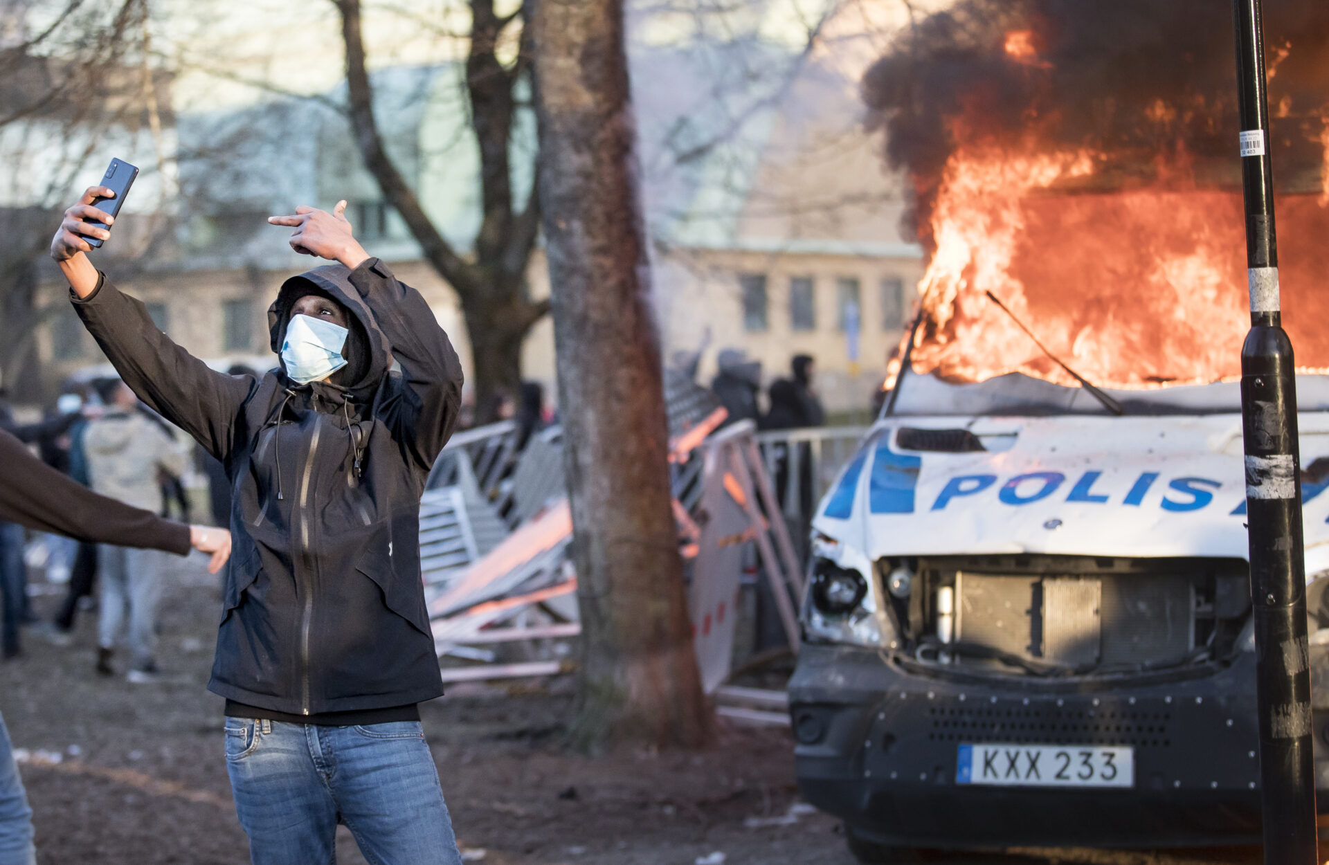 Bildtext till Kicki Nilssons bild: Den 14 april 2022 bränner Rasmus Paludan, ledare för det danska högerextrema partiet Stram kurs, en koran på ett torg i Jönköping. Dagen efter var det vår stads tur. Paludan han har beviljats tillstånd att anordna en allmän sammankomst. Han har valt platsen med omsorg Ännu en koran ska brännas. Efter kl. 19.00 stod det klart att polisen inte skulle lyckas upprätthålla ordning och insatsen avbröts. När de sista poliserna lämnade parken stod fyra polisbilar i brand. Kvar på platsen firade motdemonstranter. Kicki Nilsson, Icon Photography /TT Nyhetsbyrån/Frilans