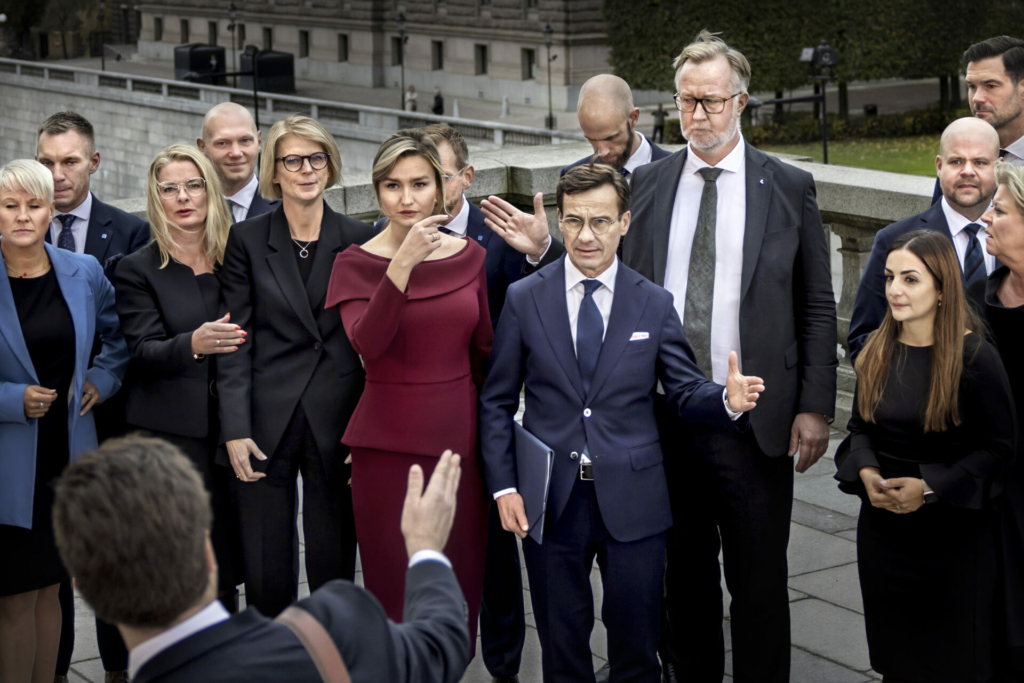 Bildtext till Thomas Karlssons bild: Statsminister Ulf Kristerssons vallöfte var att ”få ordning på Sverige”. Den första utmaningen för den nytillträdda borgerliga regeringen blev att få ordning på den traditionsenliga gruppbilden på Lejonbacken intill Kungliga slottet. Thomas Karlsson, Dagens Nyheter.