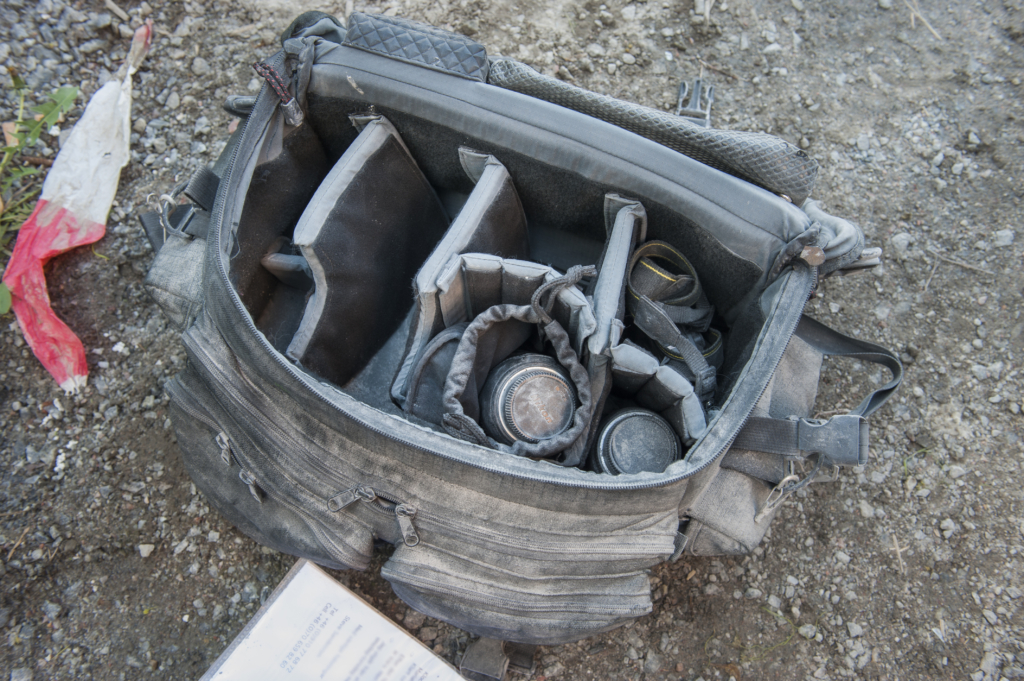 Han hade två kameror med för jobbet, och de hängde tryggt kvar på hans axel, oskadda. Men i väskan fanns tre objektiv och ett kamerakort. Han och guiden gick tillbaka för att hämta väskan, nu helt täckt av sprängdamm.