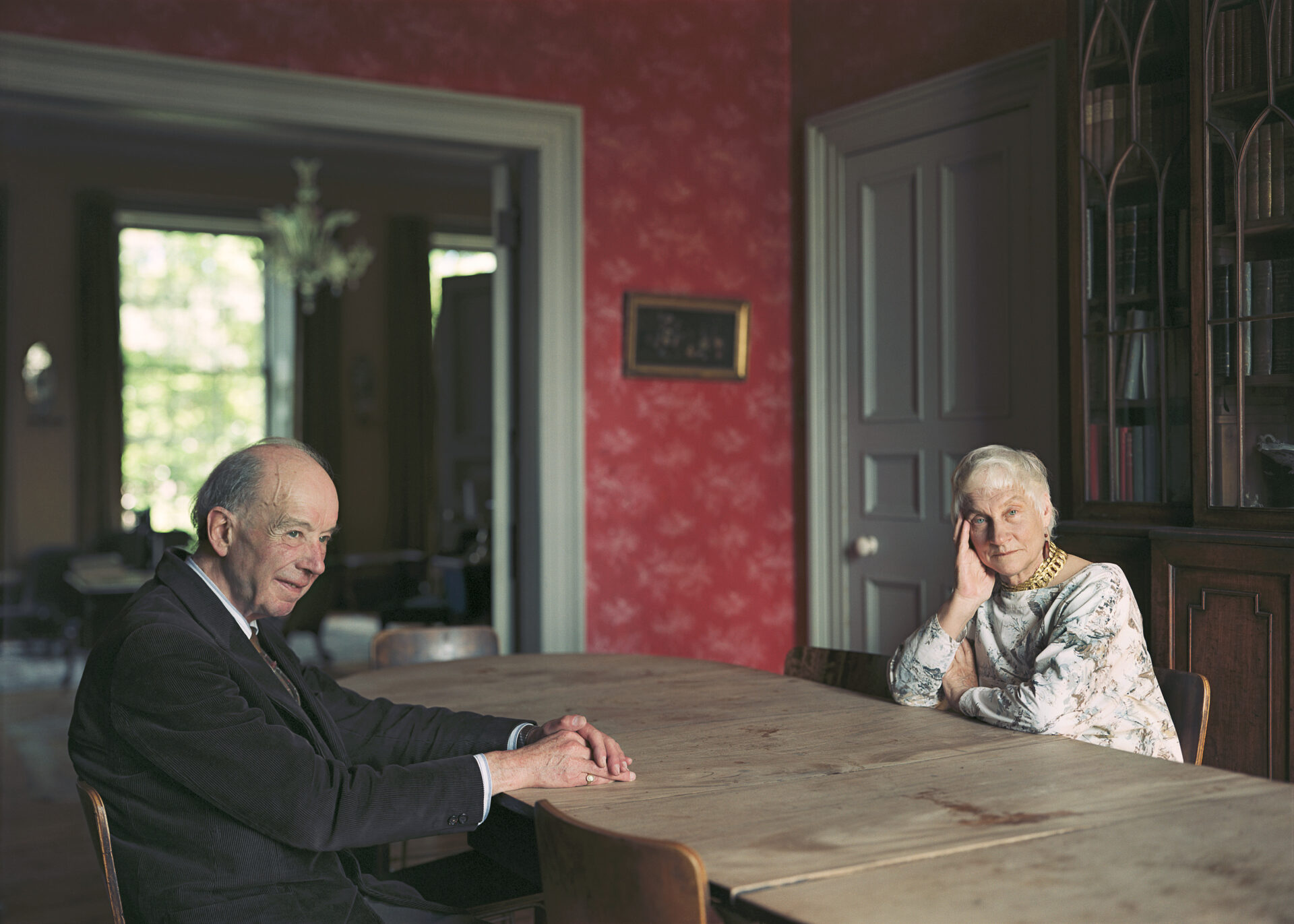 I bilden, som togs i deras hem, skiljs de åt av ett robust bord som går som en diagonal mellan dem. Det är en ovanlig komposition där ett rymligt intryck förstärks ytterligare av att vi inte ser var väggarna slutar och taket tar vid. I bakgrunden leder ett dörrvalv till ett dunkelt rum med en öppning mot en trädkrona i solljus. Giles och Eleanor upplevs som så små – omslutna av sin värld. Giles stillsamma, försiktiga leende. Eleanors skarpa blick, både penetrerande och lätt blasé. Giles klackring i guld på högerhanden, den vänstra handen som vilar ovanpå. Eleanors massiva, guldskimrande halsband som försvinner ner under klänningen. Hennes ena arm korslagd över bröstet, den andra som försiktigt låter handen stötta huvudet. De påminner om äldre par som man ibland kan se på restaurang, sittande i tystnad medan de väntar på maten, helt bekväma i varandras sällskap. Giles och Eleanor möter inte varandras blickar utan tittar i var sin riktning. Samtidigt som de framträder som två distinkt olika karaktärer ser de ut att höra ihop.
